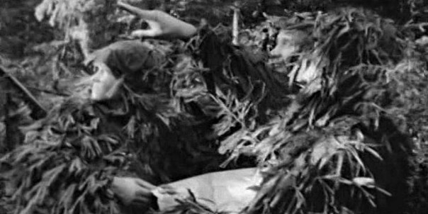 Никогда раньше не видел настолько качественного камуфляжа в документальном кино. Да и в художественных фильмах советские разведчики в маскировочных костюмах «амёба» появлялись разве что в старой «Звезде» 1946 года.