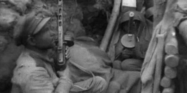 На экране — глубокие траншеи, недавно отбитые у немцев. Наверху — ожесточённая дуэль артиллерии. Бойцы вжались в «лисьи норы». А оператор должен работать… И он снимает сплошную пелену дыма с разлетающимися обломками.