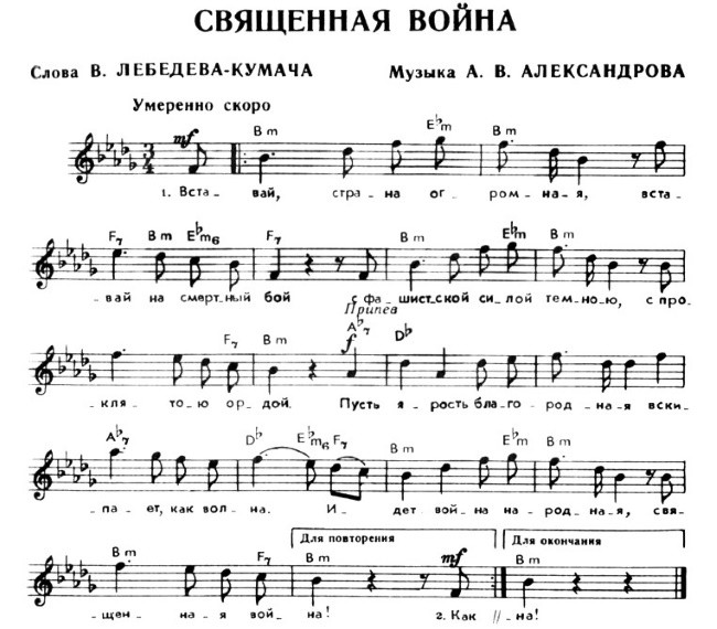 В газете стихи прочитал руководитель Краснознамённого ансамбля песни и пляски Красной Армии Александр Александров. И в тот же день положил их на музыку. Еще день заняли репетиции, а уже 26 июня коллектив исполнил «Священную войну» на Белорусском вокзале, с которого советские солдаты отправлялись на фронт.