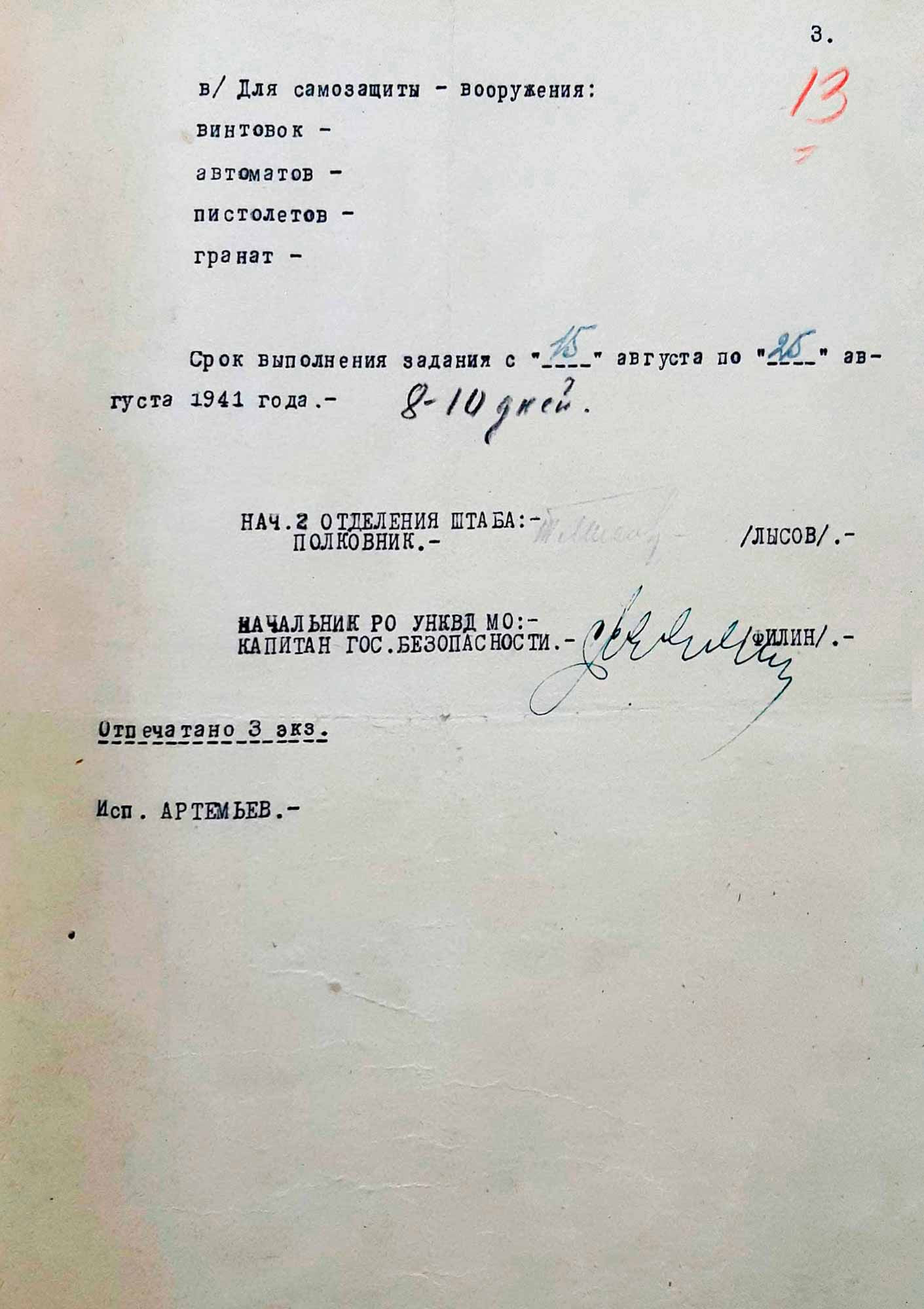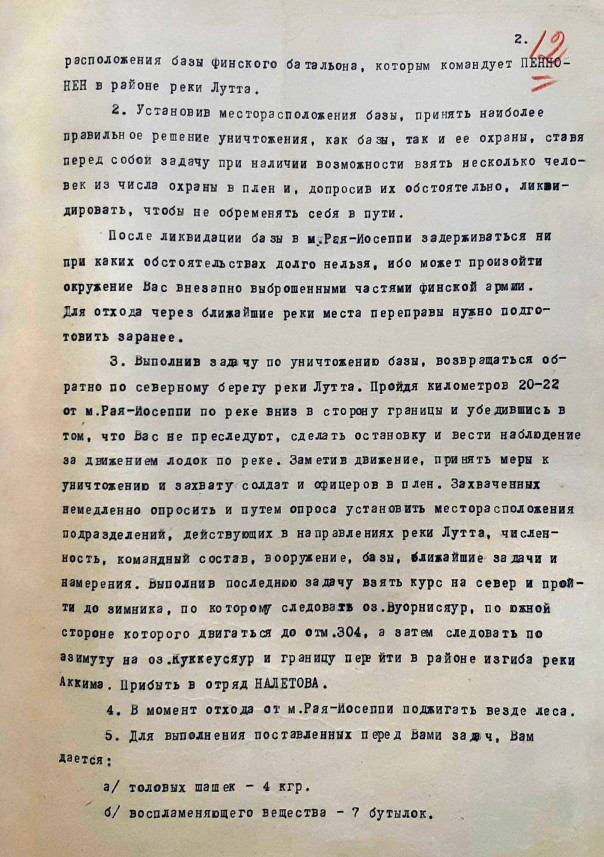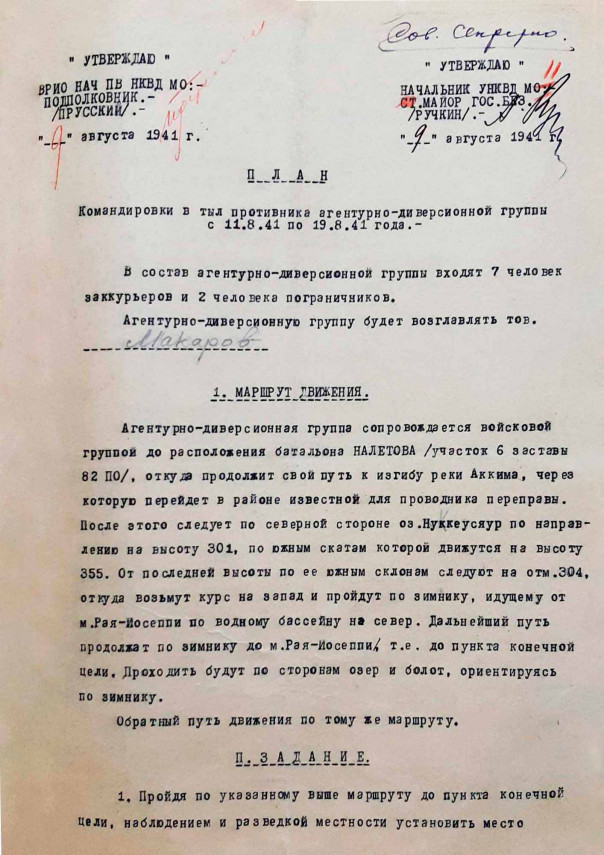 Среди рассекреченных документов есть и планы действий РДГ в тылу противника. Так, в одном из них идет речь об операции в августе 1941 года. Разведгруппа должна была установить место расположения базы финского батальона и уничтожить ее. При этом планировалось по возможности взять в плен несколько охранников и после обстоятельного допроса ликвидировать их, чтобы "не обременять себя в пути".