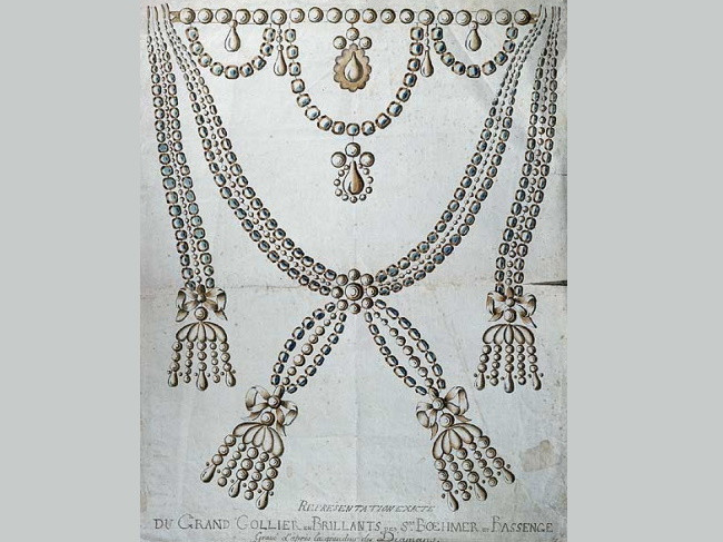 «Доверительные» отношения с королевой графиня де Ламотт не скрывала, и вскоре на ее удочку попались два парижских ювелира — Бемер и Бассанж. У них на руках было уникальное украшение — огромное бриллиантовое ожерелье, которое они изготовили еще для любовницы Людовика XV, графини Дюбарри. Но Людовик XV преждевременно скончался, не успев выкупить сокровище, стоившее колоссальных денег — 1 600 000 ливров. У Дюбарри, естественно, такой суммы не было.