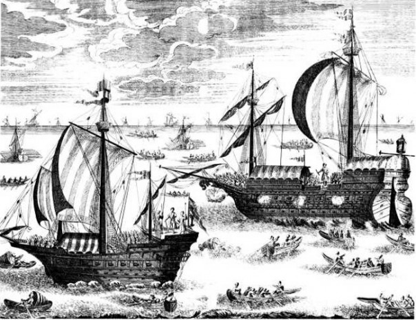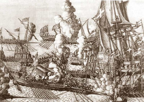 Гангутское сражение 27 июля 1714 года. Гравюра «Баталия при Гангуте» художника Алексея Зубова, 1717 год, центральный фрагмент