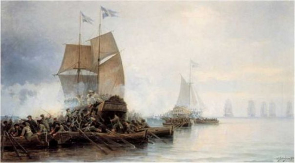 Абордаж русскими гвардейцами шведских галиота «Гедан» и шнявы «Астрильд» в устье Невы 7 мая 1703 года. Копия Л.Д. Блинова, 1890 год, с картины художника А.П. Боголюбова, 1865 год