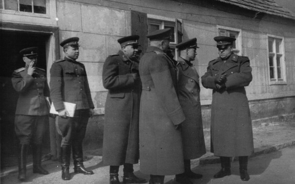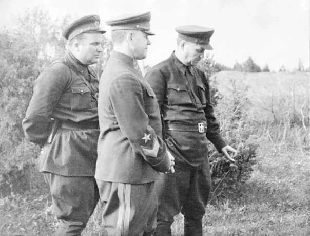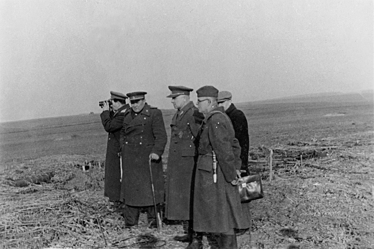 Константин Константинович Рокоссовский вместе с членом военного совета армии Алексеем Андреевичем Лобачевым и военнослужащими 16-й армии осматривают захваченную советскими войсками технику противника