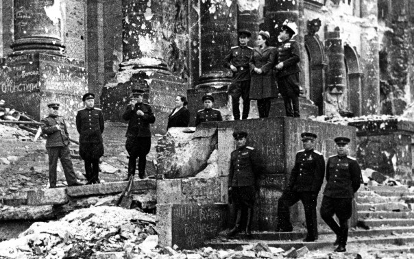 У стен Рейхстага. В верхнем ряду - третий слева В.Д.Соколовский с женой сыном и дочерью, в нижнем ряду слева направо - В.И.Казаков, С.И.Руденко, М.С.Малинин. Германия, г. Берлин, май 1945 г.