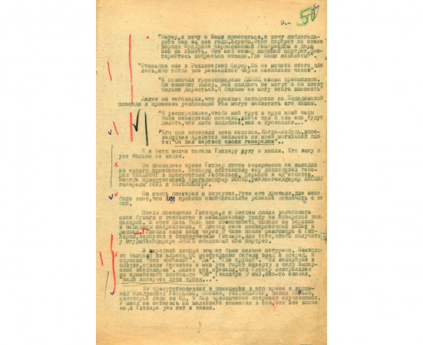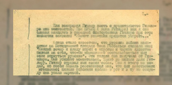 Гитлер встретил меня в передней и провёл к себе в комнату. Он подал мне руку и сказал: "Бауер (фамилия написана так, как в документе. — Прим. Лайфа), я хочу с вами проститься, я хочу поблагодарить вас за все годы службы