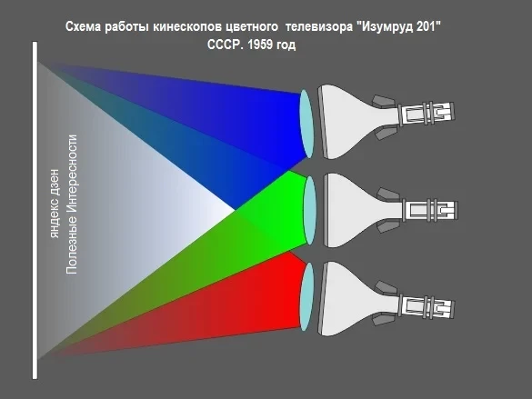 Если вместо одного цветного кинескопа использовать три черно-белых, раздав каждому свой цвет (синий, зеленый, красный), а затем все три изображения проецировать на общий экран, то получим цветное изображение.