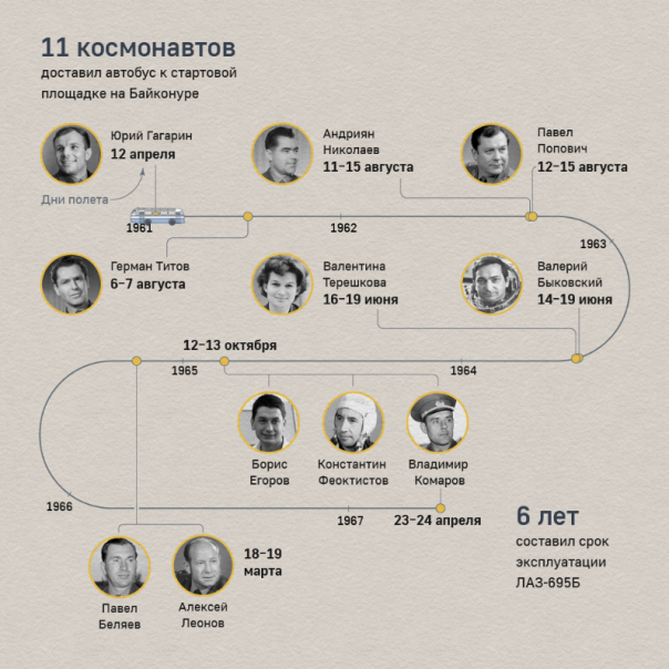 Впрочем, после этого еще почти полвека космонавтов к стартовой площадке на Байконуре возили именно в ЛАЗах, регулярно обновляя модели. Что же касается 695Б, то в течение двух десятков лет после списания автобус простоял на задворках одного из космических НИИ в Москве. В конце 1980-х годов машину отправили на реставрацию во Львов, а затем по просьбе матери Юрия Гагарина перевезли в город Гагарин Смоленской области и передали местному музею.