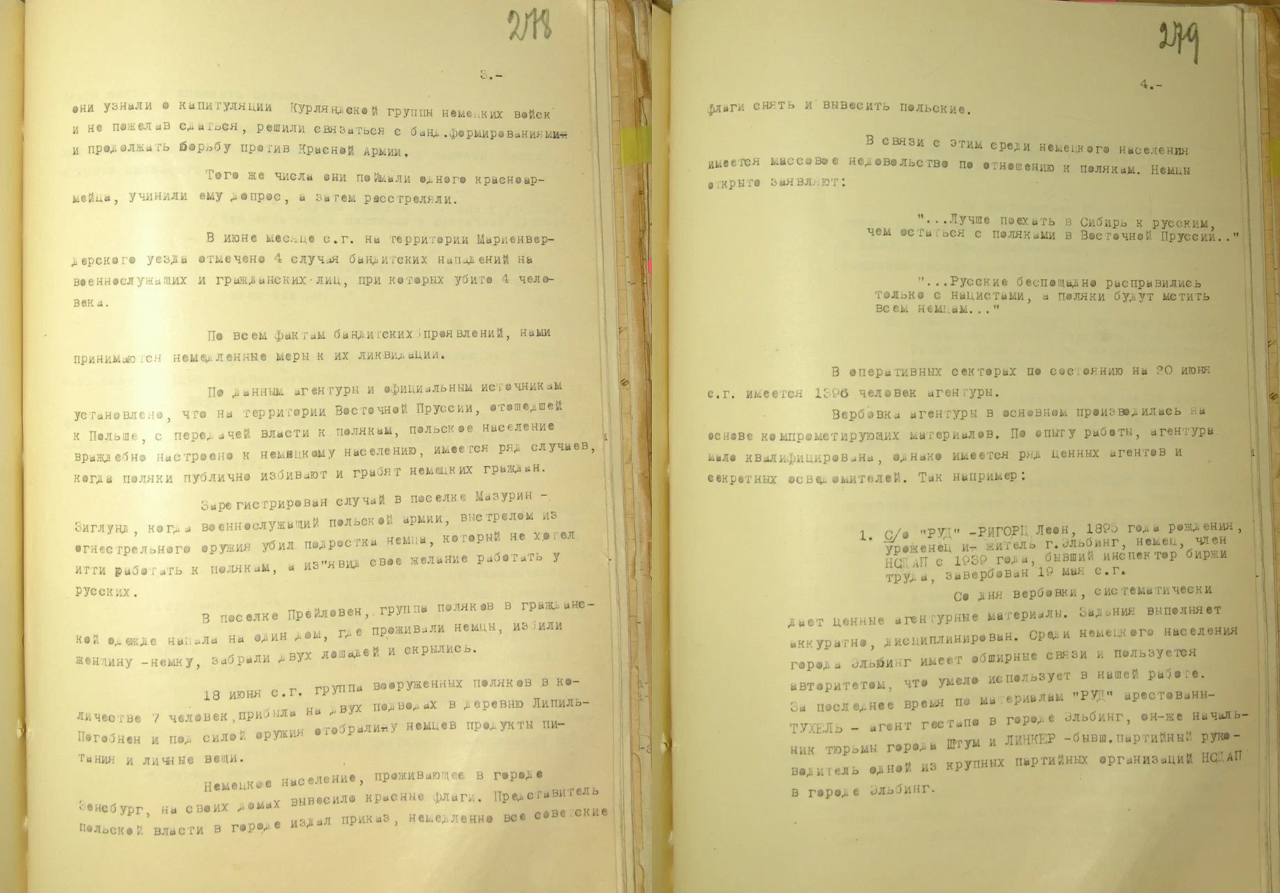 Центр общественных связей ФСБ России опубликовал на сайте ведомства архивные документы о работе советской контрразведки в Восточной Пруссии с 10 мая по 20 июня 1945 года. В них содержится информация о противодействии подрывной деятельности нацистского подполья, а также сведения о жестоком отношении поляков к гражданскому немецкому населению. Документы были взяты из архива управления ФСБ по Калининградской области.