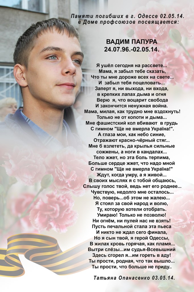 «Нам потом рассказали, что Сергей хотел уже уходить, когда депутат облсовета Маркин попросил их остаться, чтобы обеспечить безопасность стариков и женщин, находящихся на Куликовом поле», – рассказывает Надежда Филипповна в интервью изданию «Одесская правда». – Ребята посовещались и решили помочь, но мы об этом даже не знали, Сережа не брал телефон…» — плачет безутешная мать.