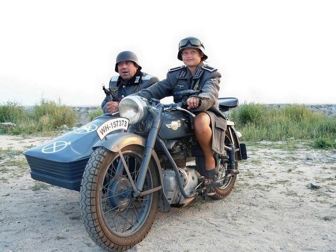 Живу в Германии. Однажды ехал по автобану и попал в пробку. Движение тыр-пыр-стоп. Возле меня ехал колоритный мотоциклист. Форма хаки, мотоцикл как из фильма про фашистов, шлем как у фашистов.