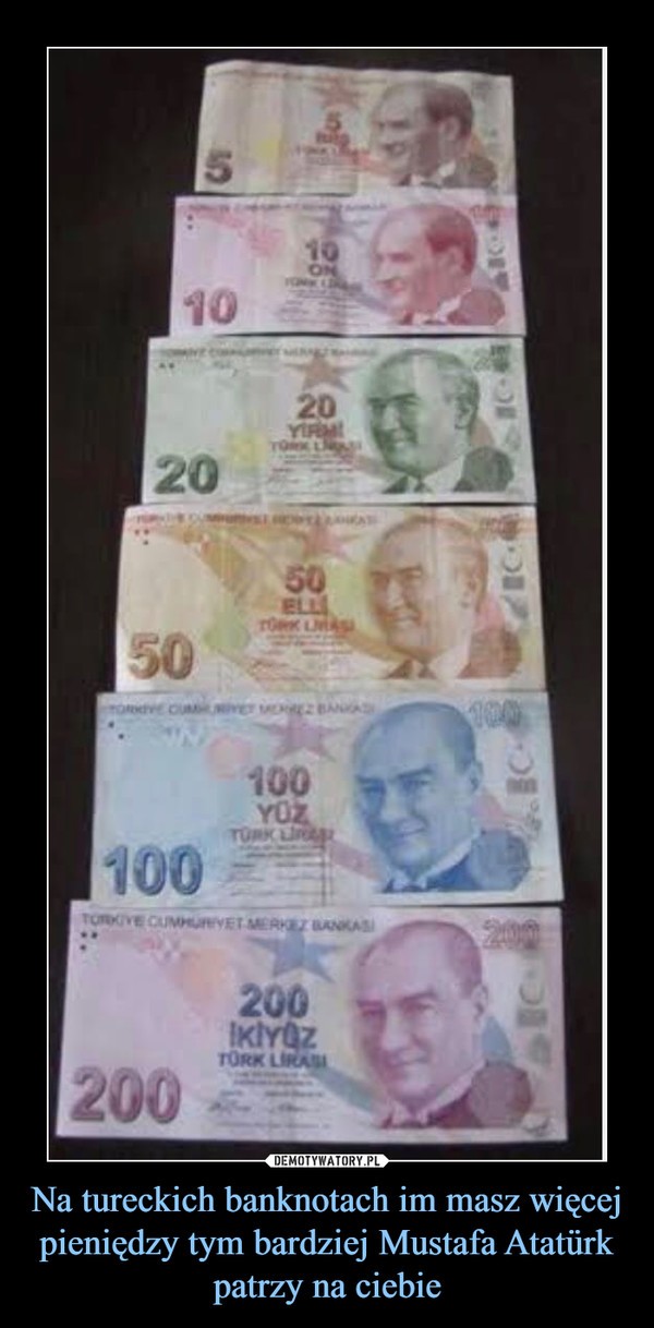 чем больше у тебя денег, тем внимательнее смотрит на тебя Мустафа Ататюрк.
