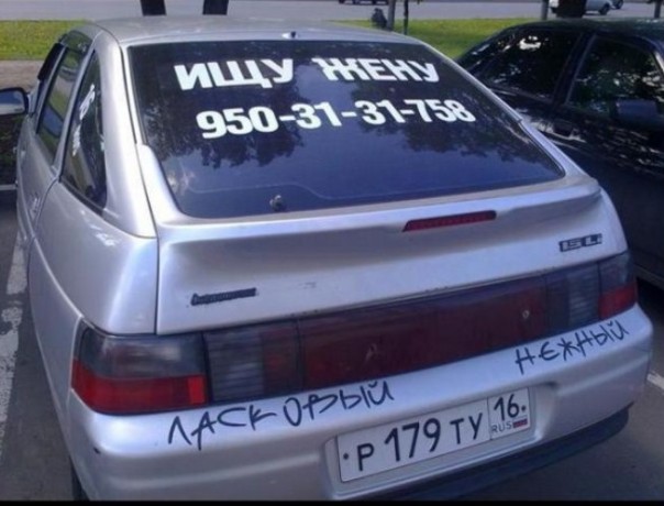 на заднее стекло своей машины - "Ищу жену" с номером мобилы, на боковые стекла - просто: