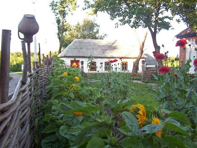Рядом диковинным чумом высилась клуня - сарай из вязанок камыша. Подворье огораживал плетень из ивовых прутьев, на частых кольях разбрелись глиняные крынки.