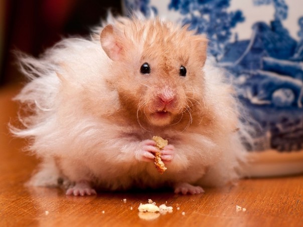 Небольшой, рыжий и очень лохматый - ангорский, может быть, если хомяки бывают ангорскими, как кошки. А с хомяком - кусочки салфетки, шелуха от семечек и монетка в копейку. На счастье, наверное.
