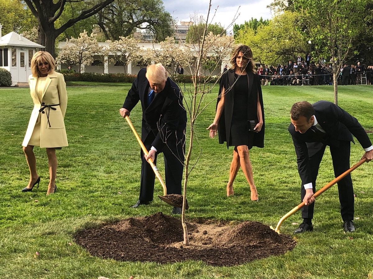 ___Раскрасневшийся Макрон активно работал лопатой. Трамп, облокотившись на свою — скептически взирал на Макрона. Макрон вопросительно посмотрел на Трампа. Трамп тут же сделал сосредоточенное лицо и прибил лопатой землю около дерева.