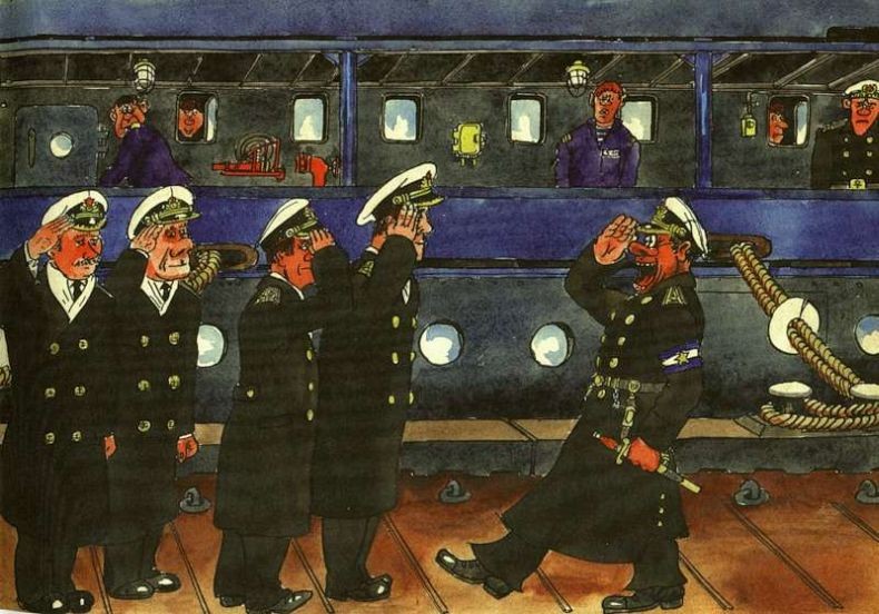 Минёр, обиженно надув губы, смотрит на флагманского минёра, тот, обиженно надув губы, смотрит на командира дивизии.