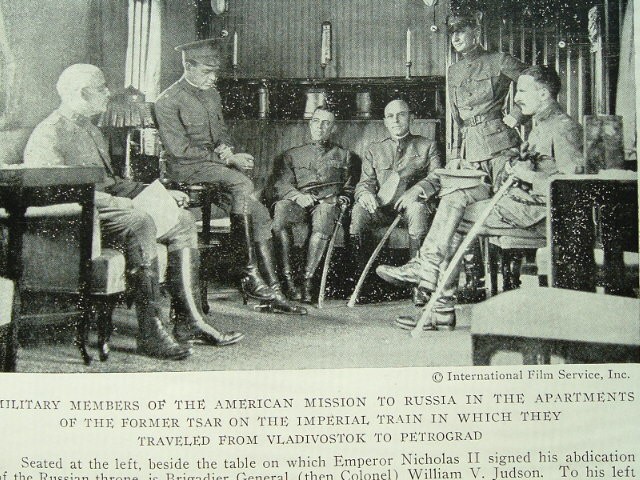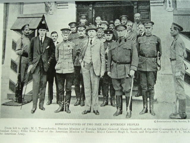 Слева направо: русский министр иностранных дел Терещенко М.И.; генерал Алексей Брусилов, в то время главнокомандующий русской армии; Элияху Рут, глава Американской Миссии; генерал Хью Скотт - начальник генерального штаба США; бригадный генерал R.E.L. Michie.