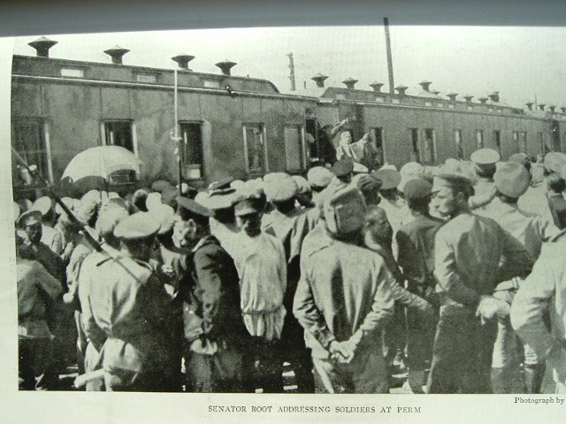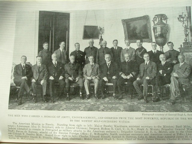 1. Руководил «Специальной Миссией» ни много ни мало как бывший Госсекретарь США Elihu Root (Элияху Рут), http://en.wikipedia.org/wiki/Elihu_Root - юрист, государственный деятель и дипломат, государственный секретарь у президента Теодора Рузвельта и получатель Нобелевской премии 1912 года, - как раз перед началом Первой Мировой войны, видимо, за большие заслуги как раз в её организации. Это человек уровня Генри Киссинджера современности. Вот что написано в Википедии относительно специальной миссии Элияху Рута: