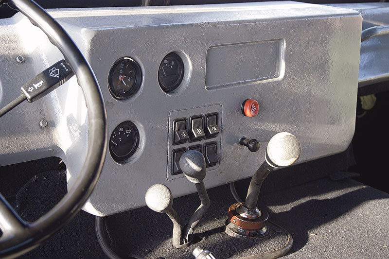 Суровая приборная панель выполненная из серого пластика с простеньким набором приборов на ней.