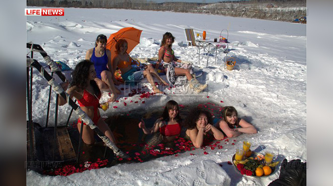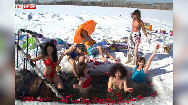 Несмотря на минус 18 градусов, девушки расположились на снегу и с безалкогольными коктейлями. Время от времени они ныряли в прорубь. Мероприятие продолжалось более получаса на берегу Красного озера.