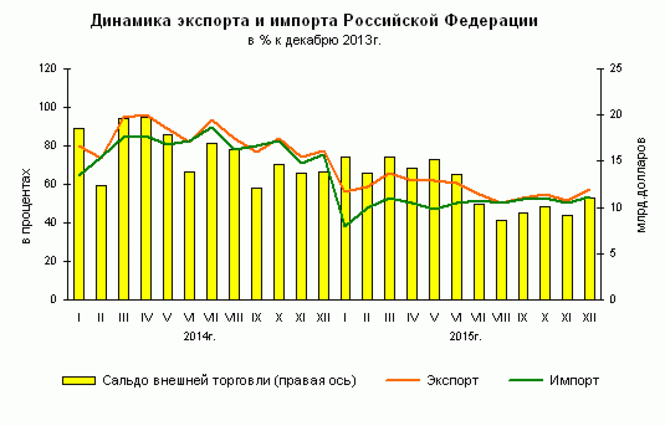 От санкций, прежде всего, пострадала внешняя торговля России. В 2015 году внешнеторговый оборот нашей страны составил лишь 66.3% к 2014 году, однако торговое сальдо, осталось положительным. Наша страна по-прежнему зарабатывает на внешних рынках больше, чем тратит. По-моему, это хорошая новость. Подробная динамика объёмов экспорта и импорта и торгового сальдо приведена на диаграмме: