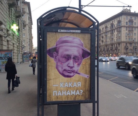 Плакат был повешен на одной из остановок общественного транспорта на Садовом кольце. Путин на плакате изображен в роли одного из героев фильма «Страх и ненависть в Лас-Вегасе». «Какая Панама?», — гласит надпись на плакате.