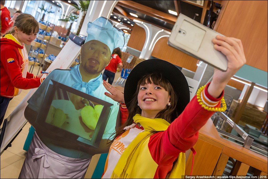 Около раздачи я увидел странную картину. Около плоской фигуры человека в поварском колпаке дети то и дело делают селфи и просто фотографируются рядом. Оказалось, это интерактивный повар, который рассказывает о блюдах сегодняшнего обеда, показывая на экране в своих руках либо этапы его приготовления, либо просто интересные факты о тех или иных продуктах.