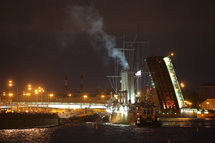 Переход "Авроры" оказался ярким зрелищем: в навигационных сумерках крейсер прошел по Морскому каналу и по Неве с полной иллюминацией, включив мощный прожектор для освещения фарватера. На крейсере первого ранга, имеющем статус корабля номер 1 ВМФ России, поднят Андреевский флаг, на палубе выстроен экипаж.