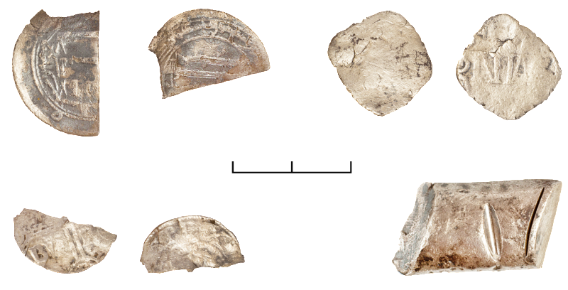 Половина аббасидского дирхема, динарии Кёльна и Дуйсбурга, обрубок серебряной платежной гривны, найденные у Привольного