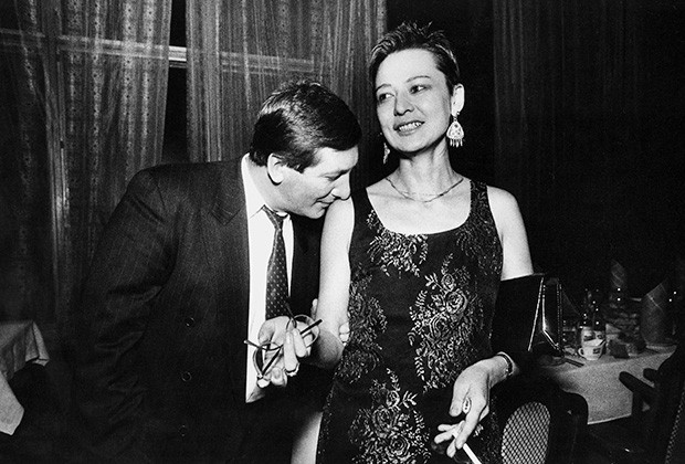 Лидер партии "Экономическая свобода" Константин Боровой и экономист Ирина Хакамада на свадьбе президента Российской товарно-сырьевой биржи Алексея Власова, 1993