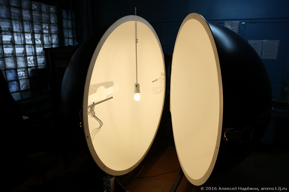 Интегрирующая сфера, в центр которой помещается лампа, позволяет точно измерить световой поток (количество света, которое даёт лампа).