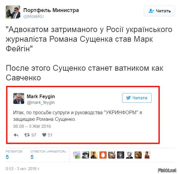 "Укринформ" глубоко возмущен задержанием в Москве в пятницу, 30 сентября, нашего собственного корреспондента Романа Сущенко и появлением в российских СМИ информации относительно обвинений его в "шпионаже". "Укринформ" считает задержание Сущенко, который работает в нашем агентстве с 2002 года, а собственным корреспондентом во Франции — с 2010 года, спланированной провокацией", — говорится в заявлении, обнародованном на сайте "Укринформа".