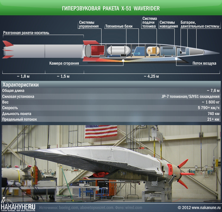 Американский действующий аналог Х-51 поразительно напоминает советский проект, забытый даже внешне. Если (по неподтвержденным данным) советская ракета развивала по прямой скорость в 10 000 километров в час (ее сбросили в стратосфере с самолета), то американский аналог разогнался до 11 200 с третьего раза (первые пуски были не слишком удачны). Сейчас в США (уже по официальным данным) планируется достичь стабильной скорости в 5–6 звуковых. В теории Х-51 должен лет через 10–15 вообще вытеснить современные баллистические ракеты.