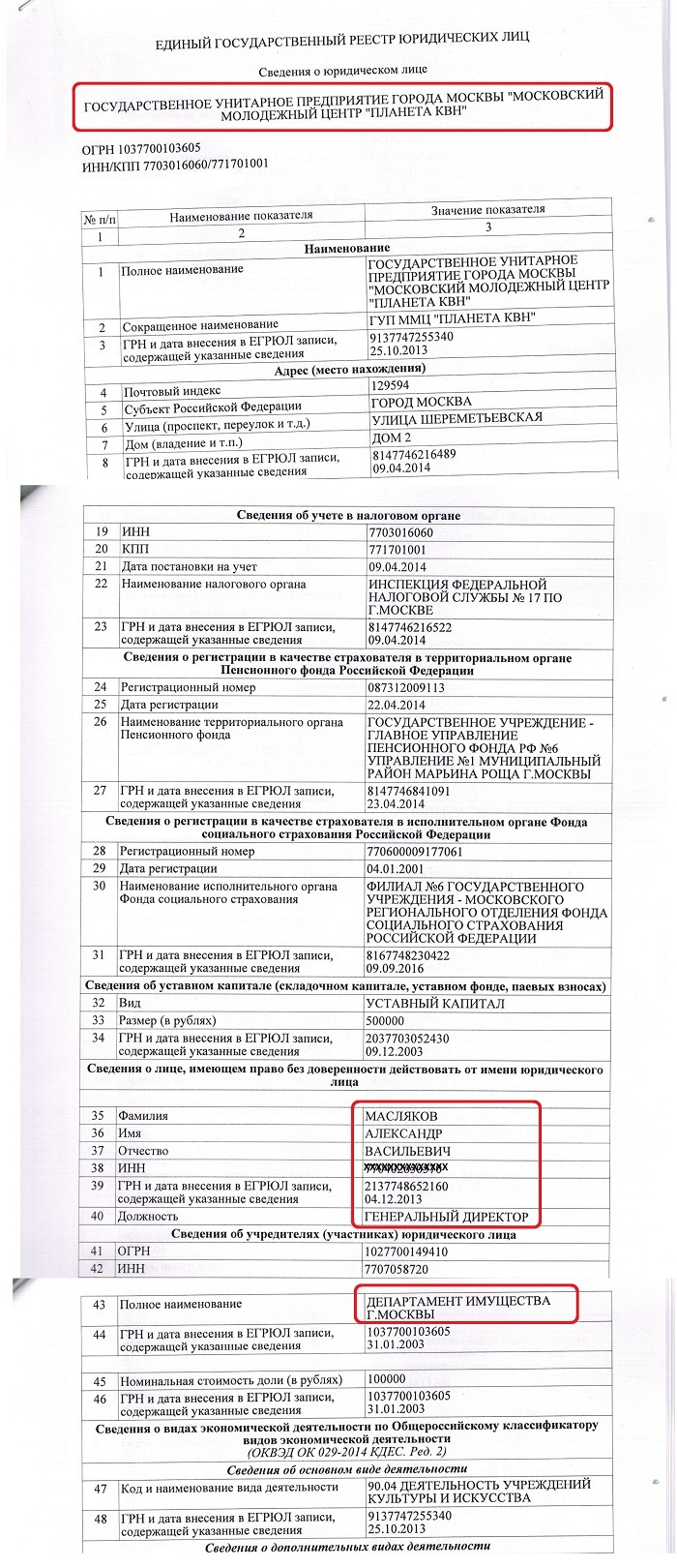 Да, кстати, обратите внимание на то, что Генеральным директором государственного унитарного предприятия «ММЦ «Планета КВН» каким-то загадочным образом оказался ни кто иной, как сам Масляков Александр Васильевич: