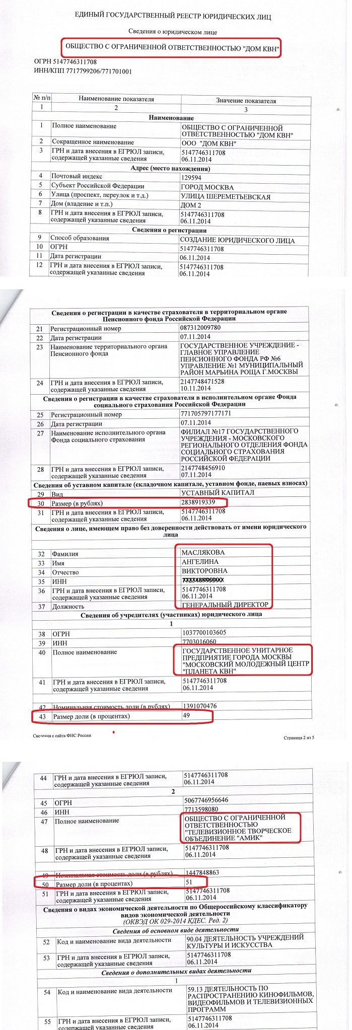 А теперь следим за руками. Итак, со стороны государства вносится в уставной капитал ООО "Дом КВН" золотая московская недвижимость и внутреннее оборудование, общей стоимостью 1 391 070 476 рублей, что по курсу на октябрь 2014 года составляло около 35 миллионов долларов США. И за это бюджетному Госпредприятию причитается лишь 49 процентов уставного капитала. А частная структура Масляковых (папа-мама-сын) вносит никому не нужный Товарный знак «Международный союз КВН», оценив его в 1 447 848 863 рубля (по курсу на октябрь 2014 г. - более 36 миллионов долларов) и получает контрольный пакет в размере 51 процента. Вот выписка из ЕГРЮЛ: