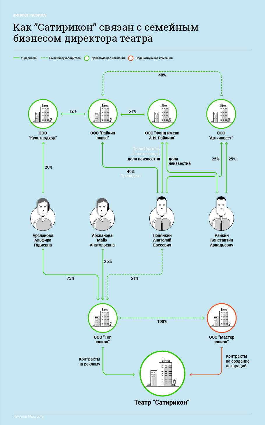 Намедни глава театра «Сатирикон», народный артист России, профессор Константин Райкин рассказал широким массам о полном цензурном беспределе в стране и о том, что мы все «клевещем, доносим. И опять хотим в клетку». Однако, как вскоре выяснилось, что вся эта революция упиралась в денежный вопрос, который вскоре был успешно решен на переговорах с министром культуры Владимиром Мединским, который тоже не меньше профессор, чем Райкин. Казалось бы, встретились мирно трое – два профессора и один российский бюджет – по-тихому перетерли и закрыли тему, позабыв и про цензуру, и про клетку. Однако, коллеги из «Лайфа», привлеченные выступлением Константина Райкина, по ходу пьесы обнаружили удивительный факт – оказывается, за период с 2015 года 86,5 млн рублей, полученных театром «Сатирикон» из российского бюджета, плавно утекли в распоряжение центра «Планета КВН», принадлежащего семейству Масляковых. Причем, как оказалось, директор несгибаемого Райкина Анатолий Полянкин связан совместным бизнесом с Ангелиной Масляковой - невесткой Александра Васильевича Маслякова, и другими структурами, принадлежащими семье Масляковых.