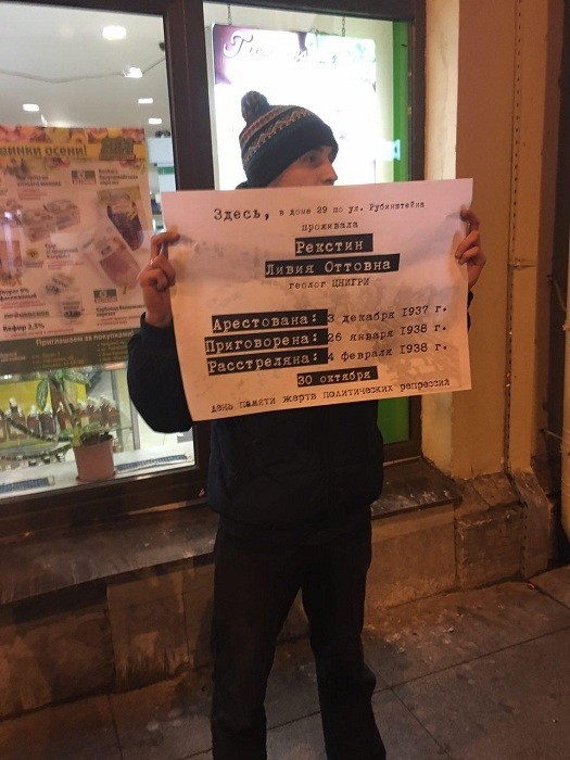 «30 октября в 19-00 мы выйдем на улицу в разных городах. На плакатах мы назовём имена этих людей. Так мы напомним нашим согражданам, что под репрессии попали не мифические «вредители» и «английскими шпионы», а самые обычные люди. Такие же люди, как те, кто сейчас живут по всей России».