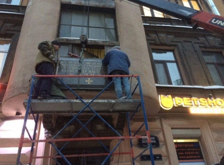 Памятную доску собирались разместить ещё 24 сентября. Заявил о таком намерении в своём "твиттере" писатель, член центрального совета Российского военно-исторического общества Армен Гаспарян. По его словам, губернатор Георгий Полтавченко уже подписал соответствующее постановление. Оплачено создание мемориальной доски было из фонда движения "Белое дело".