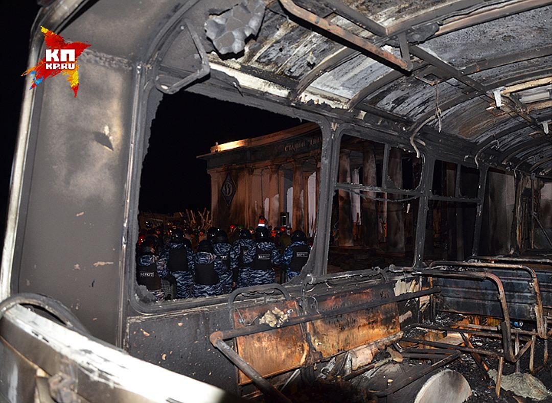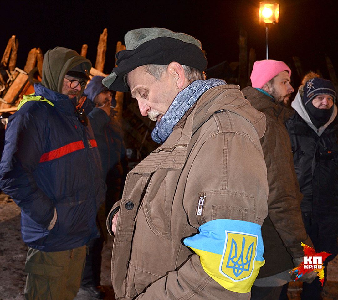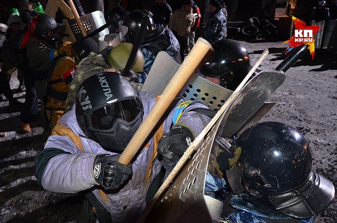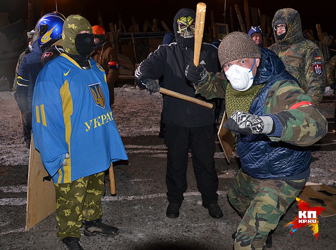 По этой ледяной каше, в темноте, снуёт больше тысячи актеров: бойцы "Беркута" держат в руках щиты и дубинки, активисты "Правого сектора" в балаклавах и масках – с битами и палками. Вокруг тлеют автобусы, на местном Крещатике звенят льдом десятки палаток, увешанные транспарантами с националистическими лозунгами. С крыши здания стадиона киевского "Динамо" в строй бойцов "Беркута" летят бутылки с зажигательной смесью. Здание стадиона выглядит, как настоящее. Рабочие сцены говорят, что строили его в натуральную величину целых два месяца!