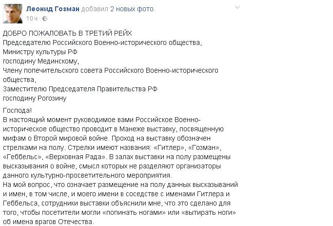 Научный директор РВИО Михаил Мягков подчеркнул, что с позицией Гозмана по вопросам истории Второй мировой категорически не согласны, но если наклейка "Гозман" его обижает, её уберут с пола выставки "Война и мифы" в Манеже.
