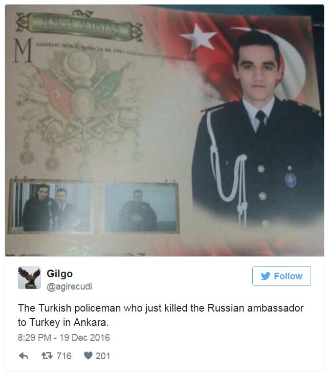 Турецкий телеканал NTV со ссылкой на свидетелей сообщил, что убийца, который стрелял в посла РФ в Турции Андрея Карлова, произвел несколько контрольных выстрелов уже после того, как Карлов упал. В сообщении отмечается, что убийца после первых выстрелов потребовал от собравшихся на выставке разойтись, после чего подошел к лежавшему на полу Карлову и несколько раз в него выстрелил.