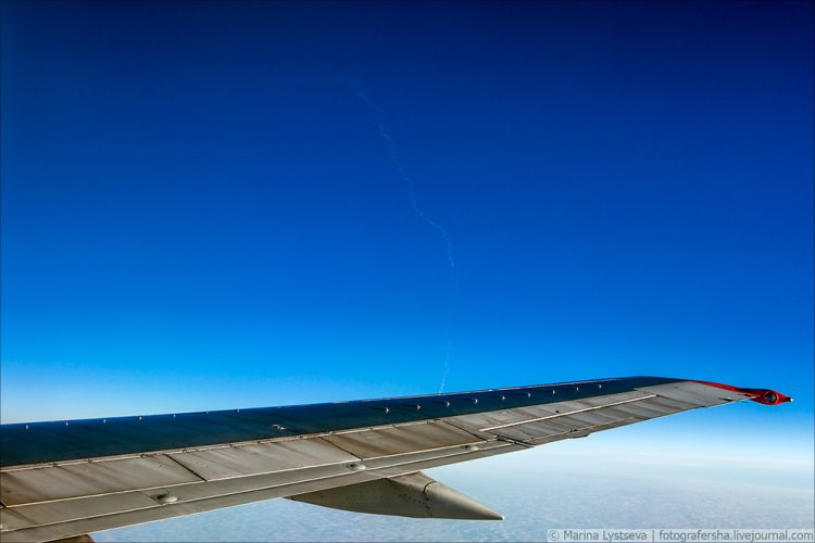 За полчаса до посадки Марина заметила инверсионный след от ракеты, достала фотоаппарат и сделала несколько кадров. Полёт тогда проходил на высоте 11 километров.