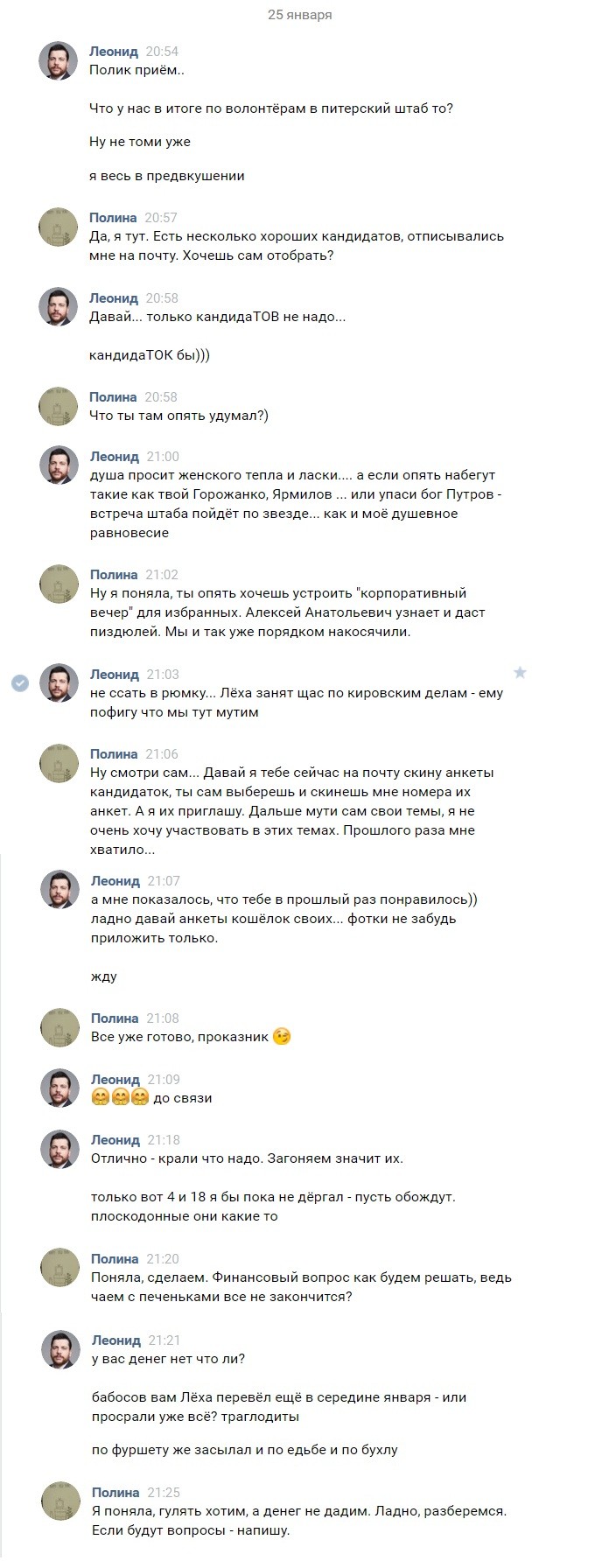 Со своими подопечными Леонид любезен примерно так же, как и со своими половыми партнерами. Правда пассий на одну ночь Леонид Михайлович порой выбирает именно из сотрудниц/сотрудников штаба Навального. Диалог с Полиной Костылёвой – координатором хомячков Навального в Санкт-Петербурге много о чём может нам рассказать.