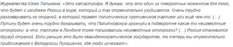 Данные рассуждения уже в корне неверны, или как в случае с Латыниной, просто лживы, уже хотя бы потому, что её позиция по делу Литвиненко является более чем ангажированной, и точно так же, ничем не подкреплённой. В этом мы не раз могли убедиться из множества материалов и разного рода интервью Юлии Леонидовны.