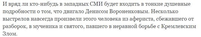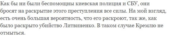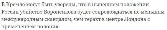 Та же ситуация и в данном случае. Не имея под своими рассуждениями никаких оснований, Латынина подводит читателя к необходимому выводу: убийство Вороненкова, ровно так же, как и Литвиненко – дело рук российских спецслужб.