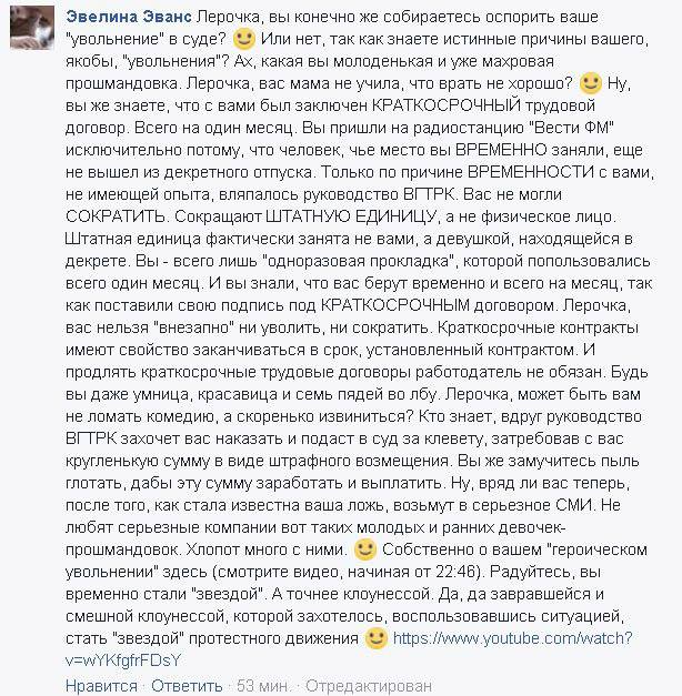 Теперь уже бывшая сотрудница ВГТРК Валерия Денисова заявила, что её "внезапно сократили" после посещения несанкционированного мероприятия 26 марта.