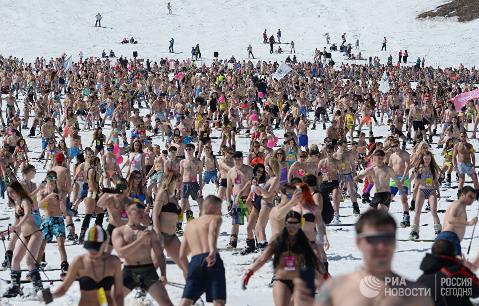 В Шерегеше — это горнолыжный курорт Кемеровской области, где проходит самый теплый фестиваль горнолыжного спорта — Grelka Fest - на склон горы Зеленая вышли люди в купальниках. Не загорать, а кататься на лыжах и сноубордах. Всего более тысячи 200 человек. Организаторы говорят, что это новый российский рекорд по массовому спуску.