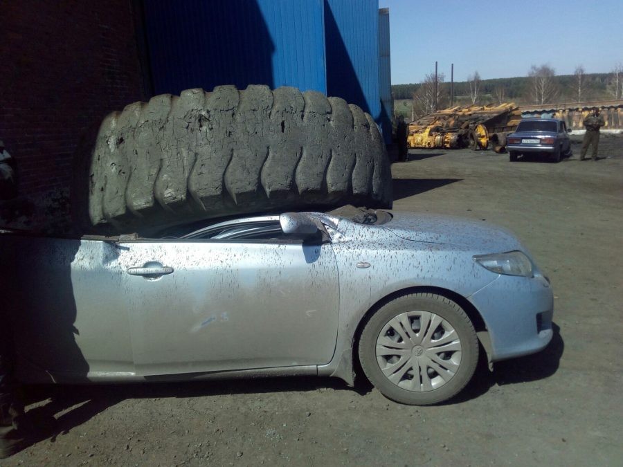 Огромное колесо самосвала упало на легковой автомобиль и раздавило его. В итоге Toyota Сorolla не подлежит восстановлению. Очевидцы выложили в Сеть фото и видео с места ЧП.