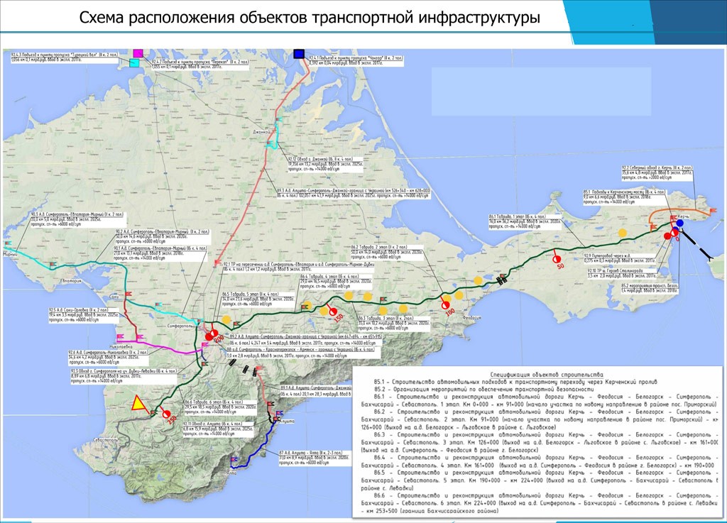 Новая четырехполосная автотрасса "Таврида" протяженностью более 260 километров соединит Керчь, где построят мост через Керченский пролив, с Симферополем и Севастополем. Первый этап строительства автотрассы (в двухполосном исполнении) планируют завершить к концу 2018 года, второй (четыре полосы) — к концу 2020 года. Ранее сообщалось, что предельная стоимость "Тавриды" составляет 138,9 миллиарда рублей.
